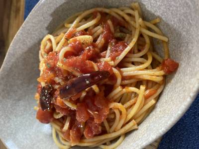 辛いソースをペンネにたっぷりからめたパスタです。赤とうがらしのピリッとした辛みが広がります。