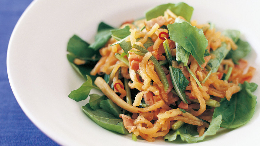 カルシウムが豊富な切り干し大根とルッコラとの組み合わせが新鮮な、温かくて甘酸っぱいサラダ。