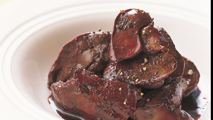 1の鍋にレバーを入れて軽く混ぜてソースをからめる。器に盛り、煮汁もかけて、黒こしょう少々を砕いて散らす。