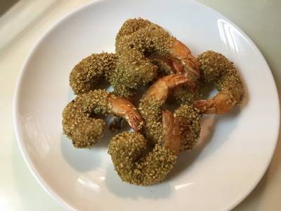 160℃の揚げ油に、えびの尾を持って入れる。表面が固まってごまがはがれなくなったら時々はしで動かし、カリッと揚げる。