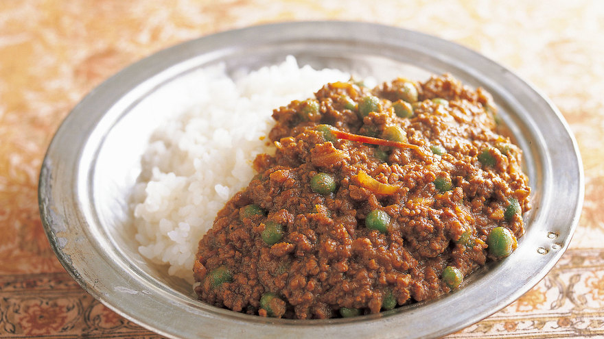 トマトを加えていため、トマトが煮くずれてひとつにまとまるようになるまでいためる。ひき肉を加えてサッと混ぜ、汁けをきったグリンピースを加えて肉の色が変わるまでいためる。