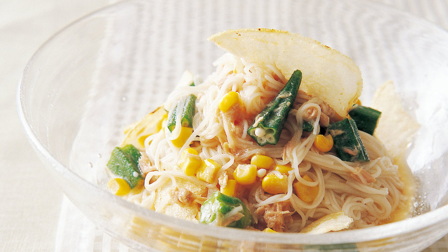 ツナとコーン、揚げ玉代わりのポテトチップスが、そうめんと好相性!子どもも大喜びのアレンジメニュー。