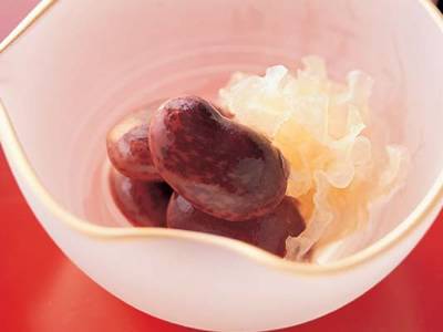 花豆は熱湯をかけて一晩おき、ふっくらと戻す。白きくらげはぬるま湯に約1時間つけて戻す。