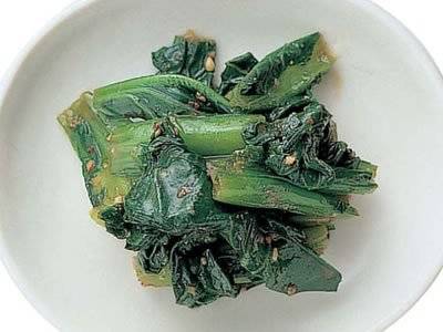 小松菜は3~4cm長さに切って塩ゆでし、冷水にとって水けを絞る。