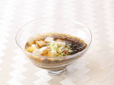 絹ごし豆腐をもずく酢といっしょにスルリといただく、のどごしのよい一品。野菜の風味と食感がアクセントです。