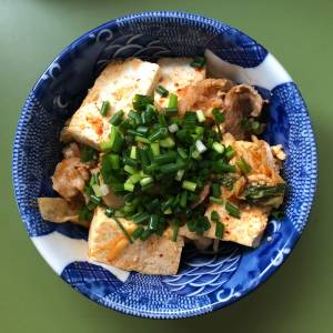 豆腐が温まったら、白菜キムチを加えていため合わせる。強火にして、しょうゆ大さじ1を回しかけて全体にからめ、火を止める。細ねぎを加え、ざっと混ぜる。
