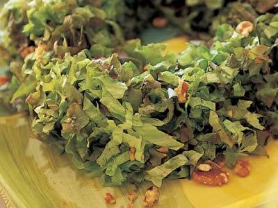 3の型に皿をかぶせてひっくり返し、2のくるみを散らす。1人分ずつ皿に取り分けて、【ドレッシング】をかける。