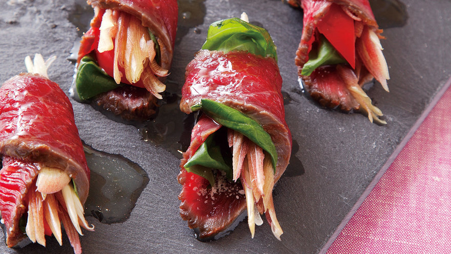 牛肉と、みょうがの相性もばっちり。バジルやチーズ、トマトと一緒に巻いた、イタリアンロールです。