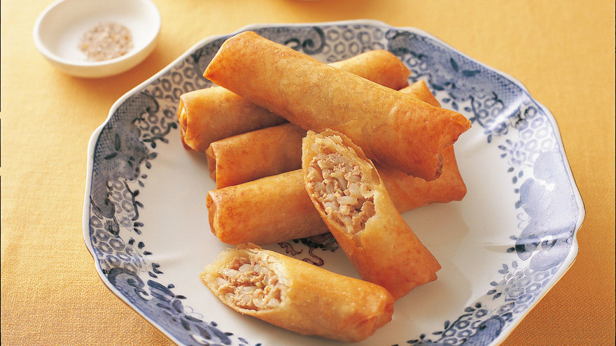 ひき肉ともやしなら、いためずに包んで揚げても十分火が通る。巻き終わりは小麦粉を溶いたのりでしっかりとめて。