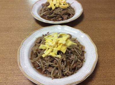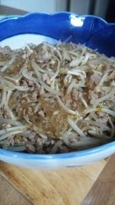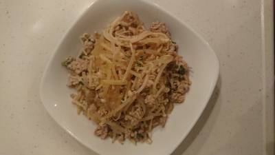 フライパンにごま油大さじ1を中火で熱し、ねぎ、しょうがを炒める。香りが出たら1のひき肉を加えて炒め、色が変わったら、もやし、えのきだけを加えて炒め合わせる。春雨を加えて混ぜ合わせ、【A】を加えて味をつける。