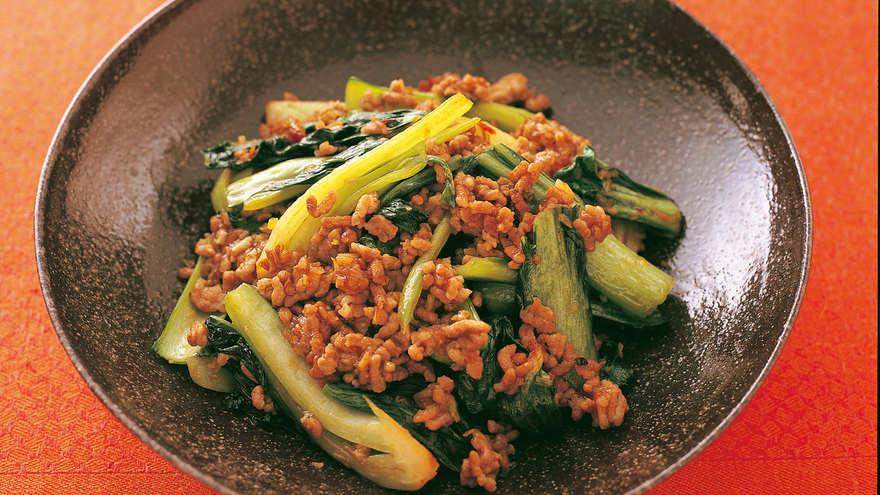 チンゲンサイはひき肉との相性もバッチリです。ピリ辛の味つけでどうぞ。