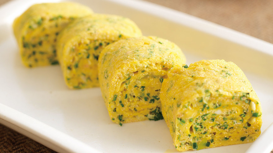 卵焼き器にごま油小さじ2を熱し、2の1/3量を流し入れる。火が通ったら奥から手前に巻き、あいたところにごま油を薄くひき、2の残りの半量を入れて同様に巻く。もう一度繰り返して焼き上げる。