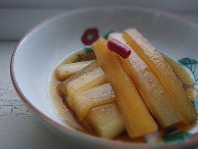 大根は皮をむき、5~6cm長さ、1cm角の棒状に切る。赤とうがらしは半分にちぎって種を除く。