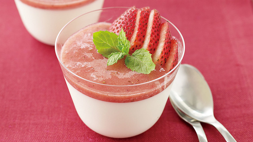 みんな大好きな牛乳プリン。白い牛乳プリンに赤いいちごが華やかで、爽やかです。デザートに出した時の歓声が聞こえてきそう!