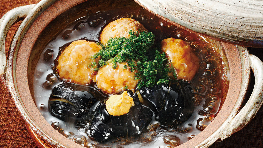 4に2の冷えたなすを加えて、30分間おき、味をなじませる。再び火にかけて、温まったら、なすと【つくね】を土鍋に移す。