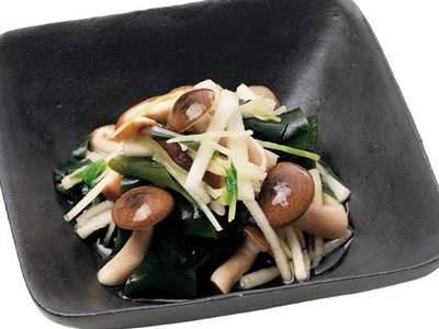 しめじは小房に分け、しいたけは石づきを取って細切りにする。いっしょに熱湯でサッとゆで、荒熱を取る。わかめとみつばはサッとゆでて水けを絞り、3cm長さに切る。
