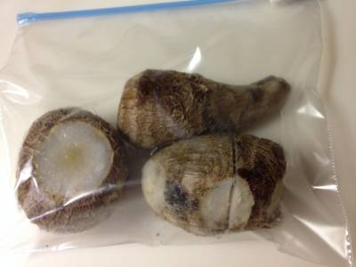 冷凍里芋のレンジ蒸しを半解凍し、切れ目から皮を引っ張ると、ツルリと手間なくむける。
