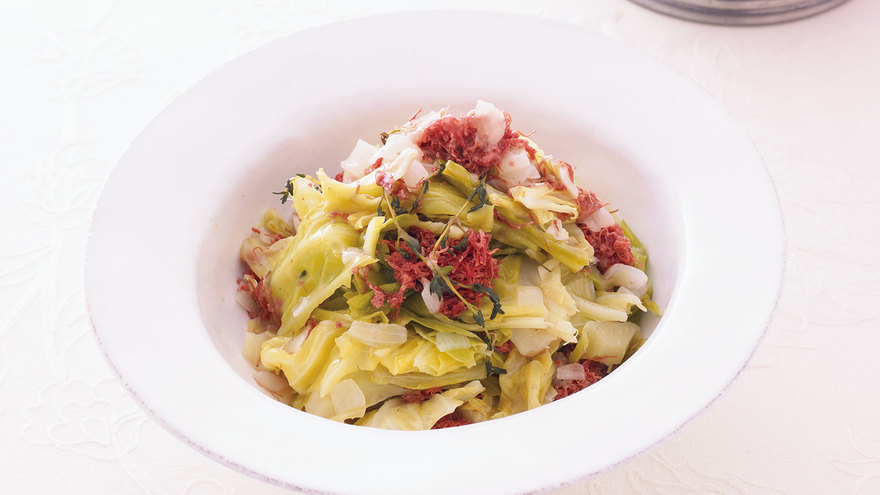 ちぎったキャベツを鍋に詰めて蒸し煮に。コンビーフから出るうまみで、だしいらずです。