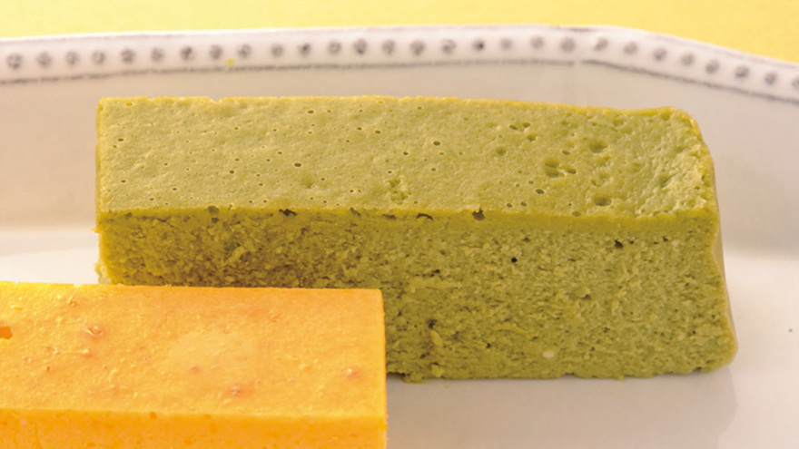 表面はしっかり焼けていて、竹串を刺すとうっすら生地がついてくるぐらいでOK。湯煎をはずしてアルミ箔を取り、粗熱が取れたら型ごと冷蔵庫で冷やす。好みの形に切る。