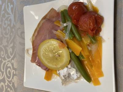 たまねぎを丸ごとコトコト煮て甘みを引き出します。トマトスープにオリーブとバジルソースがきいた一品です。