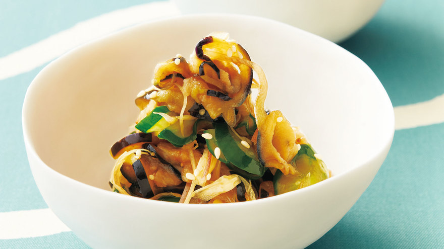 なすはヘタを落とし、皮をしま目にむいて薄い輪切りにする。水にさらし、水けをきり、塩小さじ1をまぶして10分間おく。