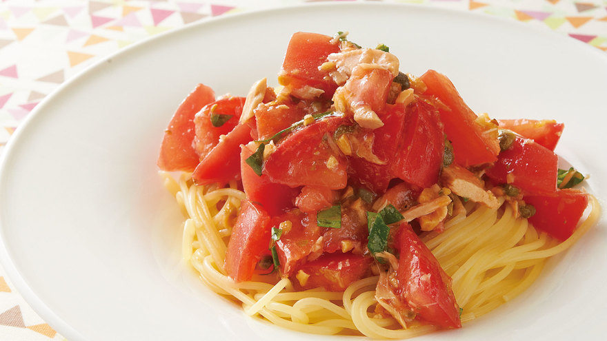 冷たいケッカソースを、パスタにかけて混ぜながら食べる「冷やあつ」のパスタ。ソースは肉や魚、パンにのせてもOK。
