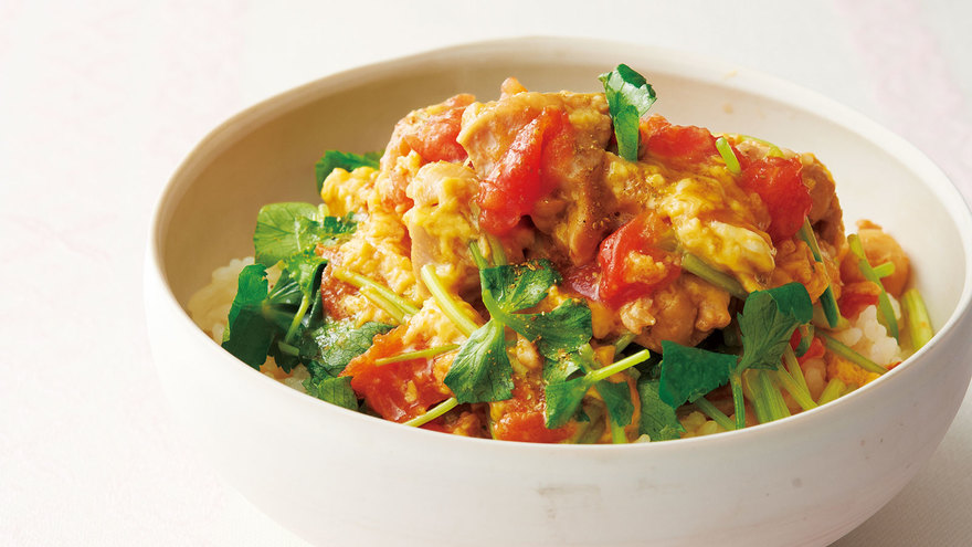 トマトと卵は相性よし、トマトとだしも実は相性がいいんです。彩りもよく、目にも鮮やかな夏の新定番丼。