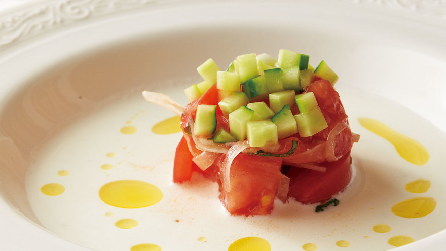 4を皿の中央に盛り、きゅうりをのせる。周りに3のスープを注ぎ、オリーブ油をふる。