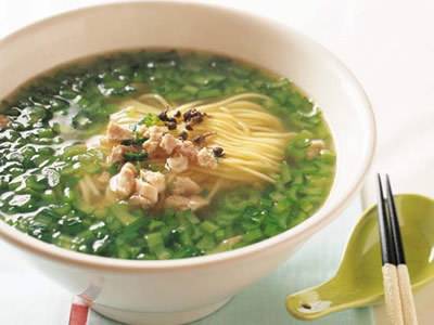 3に塩小さじ3、こしょう(白)・粗びきこしょう(黒)各少々を加えて味を調え、【ねぎ油】と1の小松菜を加えて煮立たせ、器に盛る。