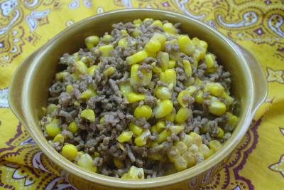 とうもろこしは半分に折って、芯に沿って粒を削り、ばらしておく。フライパンにサラダ油大さじ1を熱し、ひき肉を入れ、中火で手早くほぐすように炒める。肉の色が変わったら酒大さじ1を加えて水分をとばすように炒める。とうもろこしを加え、香りが出てくるまでじっくり炒める。