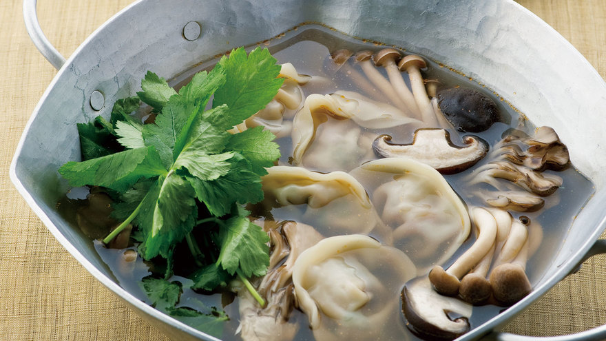 煮干しのだしにギョーザ、きのこ、みつばを入れて煮る。ギョーザは皮がプリッとするくらいが食べ頃。