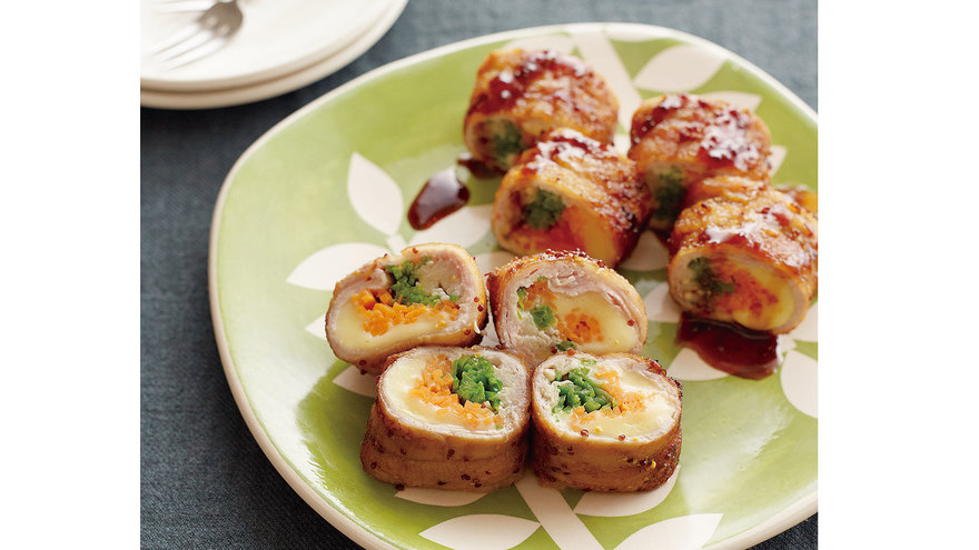 ド~ンと大きく巻いちゃう肉巻き。焼くと中のチーズが溶けて、具をまとめてくれるから食べやすい。おつまみ、お弁当にもおすすめです。