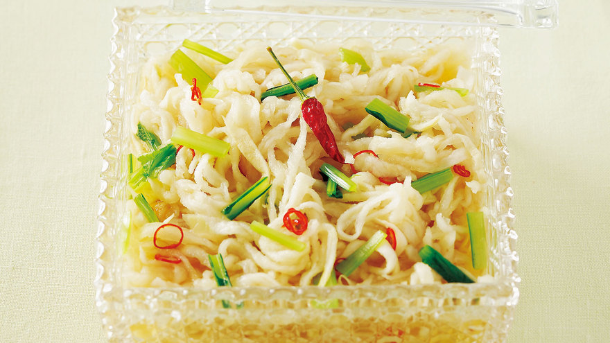 ふたをして冷蔵庫で1~2時間おく。1~2日間おくと、なじんでよりおいしくなる。好みで赤とうがらしを飾り、刻んだ小松菜を散らしても。