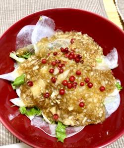 肝臓に良いほうれんそうをつかった「免疫力強化レシピ」。ソースに加えた赤とうがらしの辛みがポイントです。