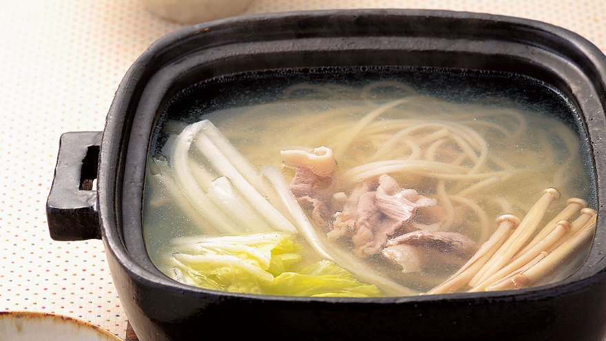 うどんがある程度煮えてからほかの具材を加えるので、火が通りやすい細めのうどんを使うのがおすすめ。うどんから塩けが出るので、あえてほかの調味料は加えず、素材のうまみを味わう。
