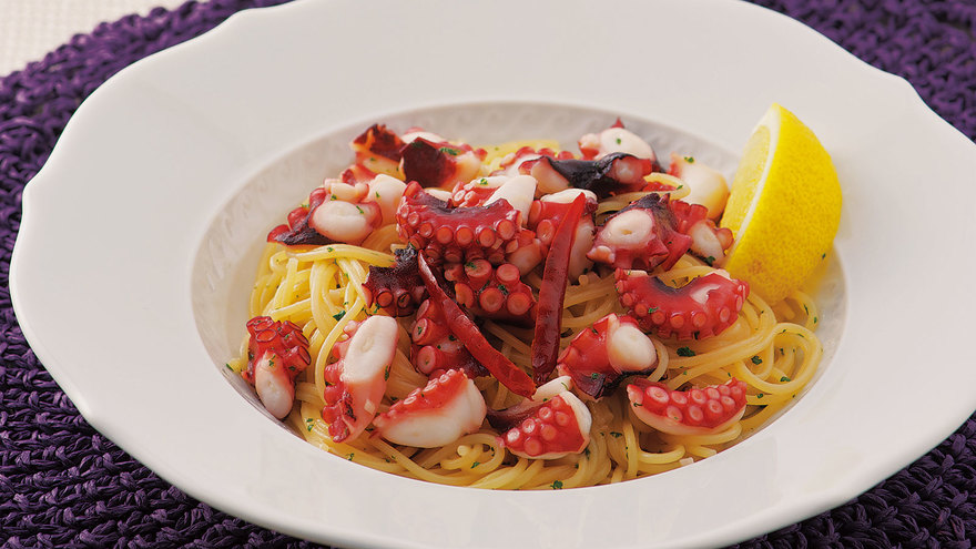 にんにくととうがらしが食欲を刺激する、オイル系パスタ。たっぷりのたこと、隠し味のアンチョビでうまみ倍増です。