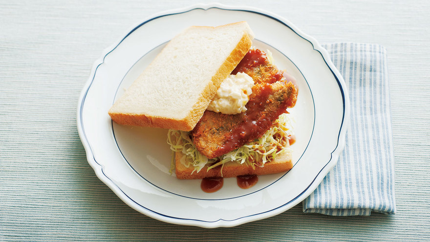 食パンにキャベツ、あじフライを順にのせ、中濃ソースをかける。【タルタルソース】をのせて、サンドする。