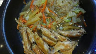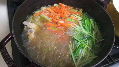 にんじんと水菜、食べやすい長さに切った春雨を加え、にんじんに火が通ったら食卓に移す。