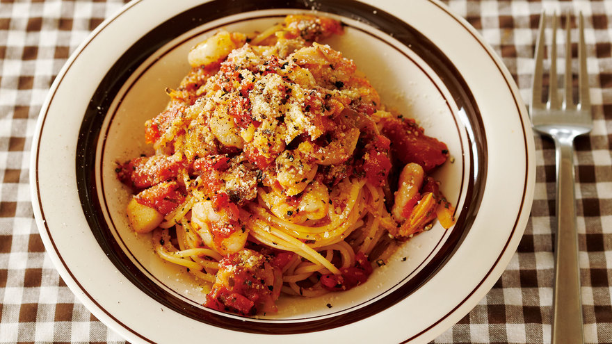 トマト味のパスタとシーフードは相性抜群で、加えるだけでちょっとリッチに、うまみも倍増します!冷凍を使えば手軽につくれますよ。