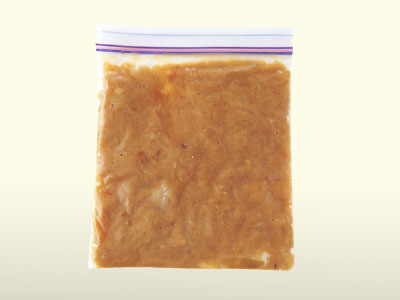 ジッパー付きの保存袋に入れて平らにする。菜ばしをギュッと押しつけて線をつけてから冷凍すると、ここから割って使える。