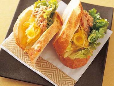 フランスパンは長さを8等分にし、それぞれ真ん中に切り目を入れる。切り目にバターをぬり、レタスをはさむ。油をきったツナをマヨネーズであえてはさみ、新たまねぎのカレーマリネもいっしょにはさむ。