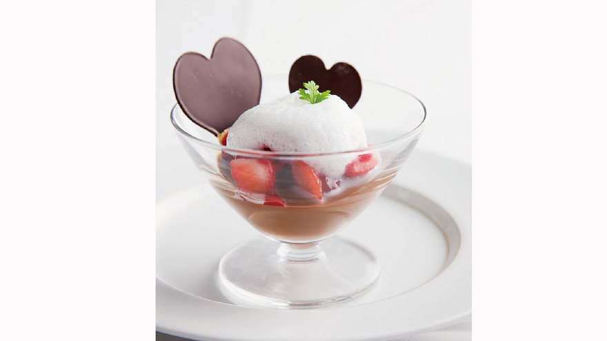 ラズベリーのソースに、ふわふわの泡がのった見た目もきれいなスイーツです。ラム酒の香りがたまりませんよ。