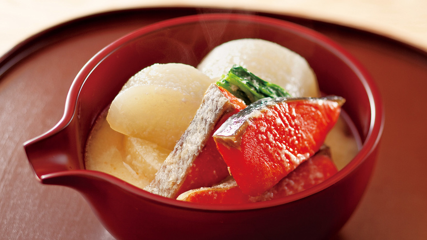 柔らかく煮た大根と、香ばしく焼いたさけの取り合わせがおいしさの決め手です。酒かすのほんのり甘い香りが絶品な冬のおばんざいの定番ですよ。