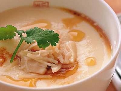 竹ぐしを刺し、澄んだ汁が出てきたら、火を止めて取り出す(卵液のような汁が出てきたらさらに2~3分間蒸す)。飾り用の帆立て貝柱をのせ、しょうゆ・ごま油各少々をかけて、1.5cm長さに切った香菜をのせる。