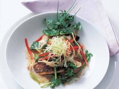 皿の中央に2のマリネを盛り、きゅうりとしょうがを合わせてのせる。2で取り分けた飾り用のハーブ類を飾る。