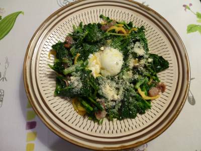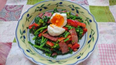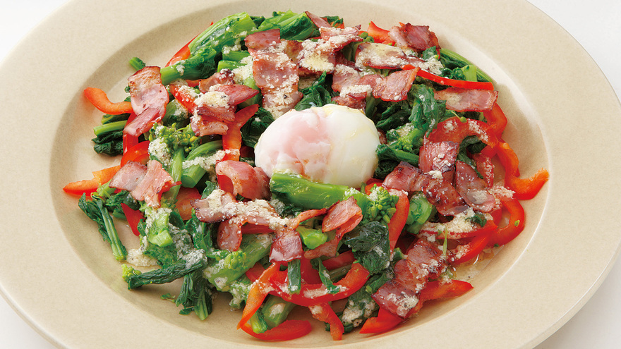 ほんのり苦みのある菜の花と、ベーコンの塩け、温泉卵のまろやかさが絶妙にマッチした彩りのよいサラダです。卵をくずし、大胆に混ぜて召し上がれ。