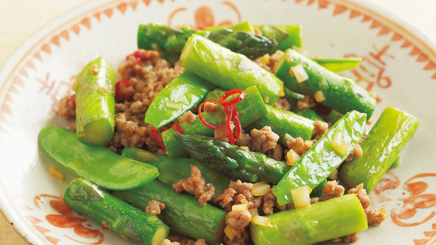ご飯がすすむピリッとしたしょうゆ風味の炒めものです。アスパラガスは色よく仕上げ、絹さやは最後に加えて、甘みと歯ごたえを引き出します。