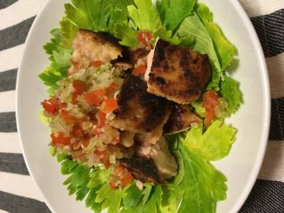 2を食べやすい大きさに切って器に盛り、3をかける。飾り用のセロリの葉をザク切りにして散らす。
