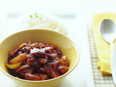 たまねぎは縦半分に切り、横1cm幅に切る。にんにくは薄皮をむき、縦薄切りにする。牛肉は重なったまま2cm幅に切り、手で1切れずつほぐして塩・こしょう各少々をふり、小麦粉をまぶしつける。