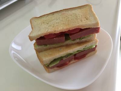 バターとマスタードをぬった面を上にして食パン1枚を置く。レタス、ランチョンミート、トマトを順に1/2量ずつのせ、バターとマスタードをぬった面が下になるように食パン1枚を重ねてはさむ。残りも同様にする。食べやすい大きさに切る。